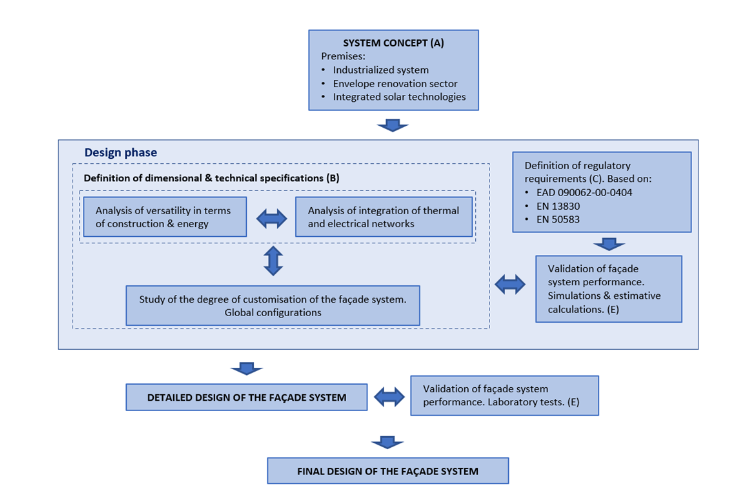 The innovative process we followed involved the challenge to achieve a highly flexible solution -in terms of geometry and enabling the incorporation of different solar harvesting technologies devices-. We wanted to provide alternative customised configurations that can be fitted to various building renovation scenarios. The final design was developed through an iterative process, guided by the requirements and specifications, defining dimensional and technical specifications for a detailed design and concluding with a final system design which has been validated and adopted as viable.