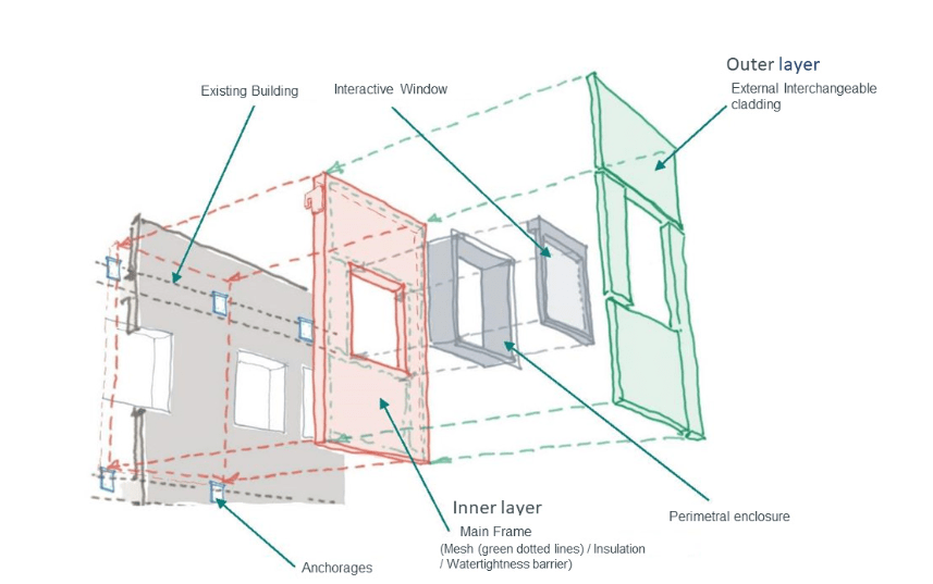 - Versatility: The system is tailored for the refurbishment sector, adaptable to different building scenarios, and capable of integrating various solar energy collection technologies based on specific energy needs. Components are interchangeable with a plug-and-play mechanical fixing system.